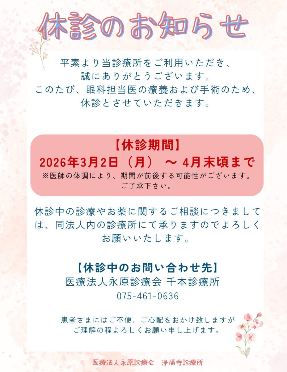 眼科担当医の療養及び手術のため、眼科(浄福寺診療所)を、下記の期間で休診させていただきます。