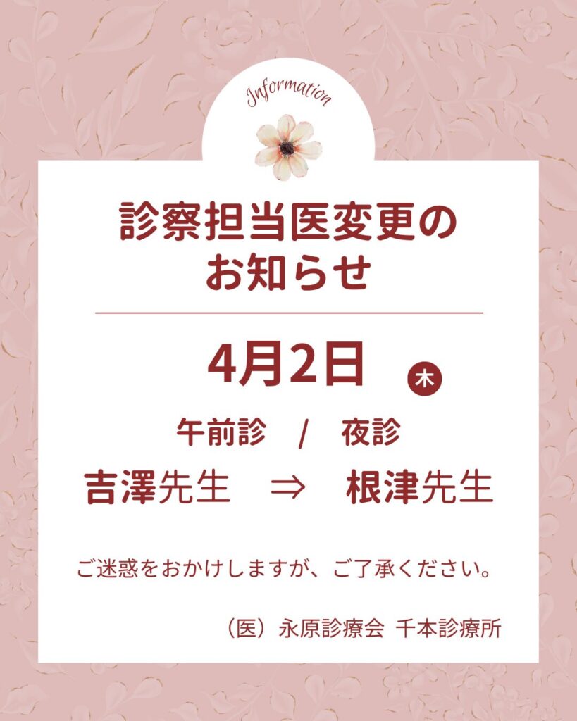 いつも当院をご利用いただき、ありがとうございます。下記の通り診察担当医変更いたします。ご迷惑をおかけしますが、ご了承ください。